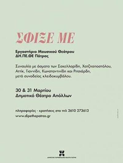 «Σφίξε με» είναι ο τίτλος της μουσικής παράστασης που θα παρουσιάσουν οι νέοι λυρικοί καλλιτέχνες του Εργαστηρίου μουσικού θεάτρου του ΔΗΠΕΘΕ Πάτρας το διήμερο 30 και 31 Μαρτίου 2014 στη σκηνή του Δημοτικού Θεάτρου «Απόλλων» στην πλατεία Γεωργίου, στην Πάτρα.