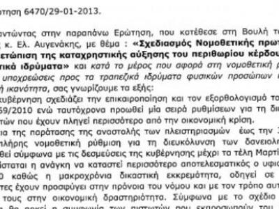 Το έγγραφο που διαβιβάστηκε σε απάντηση ερώτησης του βουλευτή της ΝΔ Λευτέρη Αυγενάκη αναφέρει ότι «υφίσταται ανάγκη να καταστεί περισσότερο αποτελεσματικός ο Ν. 3869/2010, καθώς η μακροχρόνια δικαστική εκκρεμότητα, οδηγεί σε ομηρία όσους δανειολήπτες έχουν προσφύγει στην πρόνοια του νόμου και με τον τρόπο αυτό καθυστερεί η επάνοδός τους στην οικονομική δραστηριότητα».
