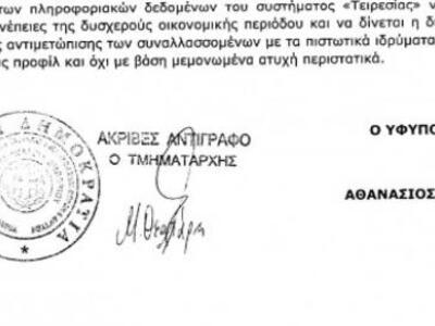 Παράλληλα θα υπάρξει μέριμνα για τη βελτίωση του υφιστάμενου πλαισίου, ώστε κατά την αξιολόγηση των πληροφοριακών δεδομένων του συστήματος «Τειρεσίας» να λαμβάνονται υπόψη οι συνέπειες της δυσχερούς οικονομικής περιόδου και να δίνεται η δυνατότητα μιας πιο ευέλικτης αντιμετώπισης των συναλλασσομένων με τα πιστωτικά ιδρύματα,ανάλογα με το συνολικό τους προφίλ και όχι με βάση μεμονωμένα ατυχή περιστατικά.