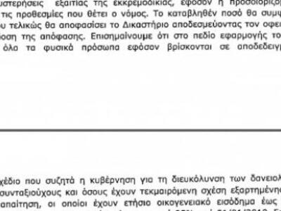 Τις βασικές πτυχές του σχεδίου - ανάσα που συζητά η κυβέρνηση με την Τροϊκα για την τροποποίηση του νόμου για τα υπερχρεωμένα νοικοκυριά, αποκαλύπτει έγγραφο του υφυπουργού Ανάπτυξης Αθανάσιου Σκορδά, το οποίο διαβιβάστηκε στη Βουλή στις 18 Φεβρουαρίου.