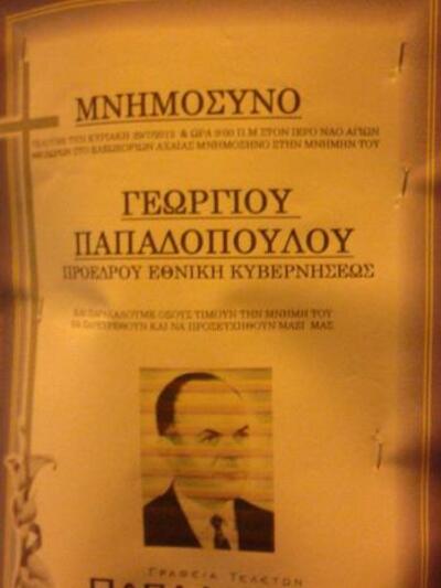 Μνημόσυνο για τον πραξικοπηματία Γεώργιο Παπαδόπουλο έχει προγραμματιστεί για αυτή την Κυριακή 29 Ιουλίου στις 9 το πρωί στo Ελαιοχώρι Αχαΐας, στον Ι.Ν. Αγίων Θεοδώρων και σύμφωνα με πληροφορίες, η πρωτοβουλία ανήκει στην Τ.Ο. της Χρυσής Αυγής στη Δυτική Αχαΐα.
