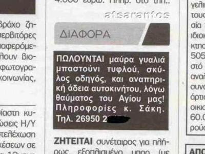 "Πωλούνται μαύρα γυαλιά, μπαστούνι τυφλού, σκύλος οδηγός και αναπηρική άδεια αυτοκινήτου, λόγω θαύματος του Αγίου μας!".