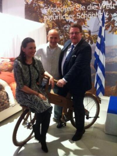 Με τον Χανς Γιόακιμ Φούχτελ σε ρόλο φωτογράφου, η Όλγα Κεφαλογιάννη πόζαρε πάνω σε οικολογικό ποδήλατο χθες το βράδυ στην εκδήλωση που διοργάνωσαν το υπουργείο Τουρισμού σε συνεργασία με τον ΕΟΤ στο Βερολίνο.