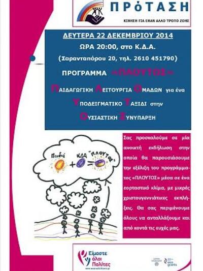Ανοιχτή εκδήλωση για την εξέλιξη του προγράμματος "Πλούτος" θα πραγματοποιηθεί τη Δευτέρα 22 Δεκεμβρίου 2014 και ώρα 20:00 στο Κέντρο Δημιουργικής Απασχόλησης στην οδό Σαρανταπόρου 20.