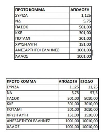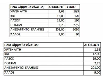 Τα έσοδα; Όποιος ποντάρει 10 ευρώ στον ΣΥΡΙΖΑ για πρώτο κόμμα θα εισπράξει 11,25 ευρώ, αν “πιάσει” ως πρώτο κόμμα τη Νέα Δημοκρατία θα έχει έσοδα 57,5 ευρώ, ενώ το ΠΑΣΟΚ 5010 ευρώ!