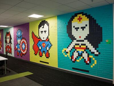 Γι’ αυτό το λόγο αφιέρωσε μερικές εβδομάδες και σπατάλησε πάνω από οχτώ χιλιάδες post – it προκειμένου να δημιουργήσει τοιχογραφίες που απεικονίζουν γνωστούς σούπερ ήρωες.