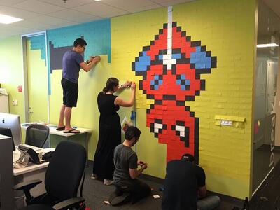 Το αφεντικό του προφανώς ενθουσιάστηκε με την ιδέα, αφού του έδωσε τριακόσια δολάρια για την αγορά των υλικών, ενώ παράλληλα βοήθησε εκείνον και τους υπόλοιπους υπαλλήλους να τα κολλήσουν στον τοίχο δημιουργώντας εικόνες του Superman, του Spider – man και της Wonder – woman που μοιάζουν σαν να έχουν πίξελ.
