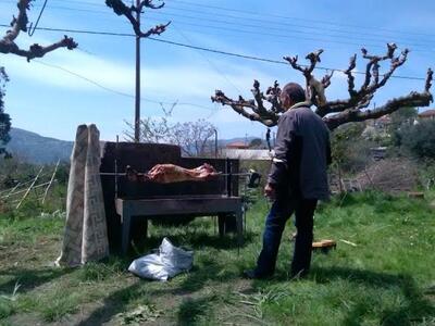 12:00 Κοκορέτσι, αρνί, κοντοσούβλι. Τα κάρβουνα πήραν φωτιά, οι σούβλες έχουν ξεκινήσει και γυρνάνε ήδη, για τνα ετοιμαστούν τα παραδοσιακά εδέσματα για την ημέρα της Λαμπρής.