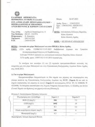 "Σας αποστέλλουμε συνημμένα τις μετρήσεις που μας έδωσε η Διεύθυνση Περιβάλλοντος της Περιφέρειας Δυτικής Αχαΐας οι οποίες έγιναν μετά από αυτοψία στο ρέμα της Μαλιαγκούς. Όπως βλέπετε οι τιμές είναι απαγορευτικές. Μετά από βροχόπτωση ό,τι υπάρχει στο συγκεκριμένο ρέμα καταλήγει στο ποτάμι της Σερδινής, στον ποταμό Πείρο και στον Πατραϊκό κόλπο.