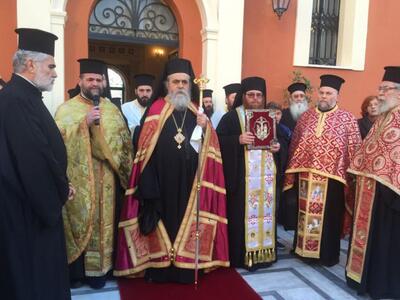 Την Ιερά Εικόνα έξωθεν του Ιερού Ναού της Αγίας Κυριακής, απουσιάζοντος του Σεβασμιωτάτου Μητροπολίτου Ηλείας κ. Γερμανού, ο οποίος ως γνωστόν ευρίσκεται στο Σαμπεζύ της Γενεύης, συμμετέχοντας ως εκπρόσωπος της Εκκλησίας της Ελλάδος στις εργασίες της Προσυνοδικής Συνάξεως των Προκαθημένων των Ορθόδοξων Εκκλησιών, υποδέχθηκε ο Θεοφιλέστατος Επίσκοπος Ωλένης κ. Αθανάσιος, οποίος μετά την δέηση εισόδευσε αυτήν εις τον Ιερό Ναό, όπου και εψάλει προεόρτιος Αρχιερατικός Εσπερινός μετ’ αρτοκλασιών και Θείου Κηρύγματος υπό του ιδίου, με αναφορές στον Ιερομάρτυρα Άγιο Χαράλαμπο και στον Άγιο Γρηγόριο τον Θεολόγο, μεταφέροντας παράλληλα και τις ευχές του Σεβασμιωτάτου Μητροπολίτου κ. Γερμανού από την Γενεύη.