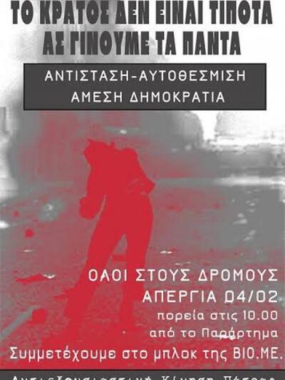 "H Αντιεξουσιαστική Κίνηση Πάτρας συμμετέχει στην απεργιακή κινητοποίηση την Πέμπτη 4 Φεβρουαρίου και ώρα 10.00π.μ., στην πορεία στο Παράρτημα. Στηρίζουμε το Μπλοκ της πρωτοβουλίας αλληλεγγύης στη Βιο.Με Πάρας.