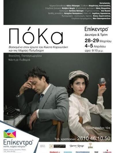 Το Επίκεντρο+, μετά τη μεγάλη επιτυχία της παράστασης του ΔΗΠΕΘΕ Καβάλας «Ισορροπιστής Αεροσκαφών» με το Δημήτρη Πιατά προτείνει στο Πατρινό θεατρόφιλο κοινό, για τα επόμενα 2 Δευτερότριτα την παράσταση «ΠόΚα», ένα έργο βασισμένο στην πιο πολυσυζητημένη σχέση στον χώρο της ποίησης, του Κώστα Καρυωτάκη και της Μαρίας Πολυδούρη.