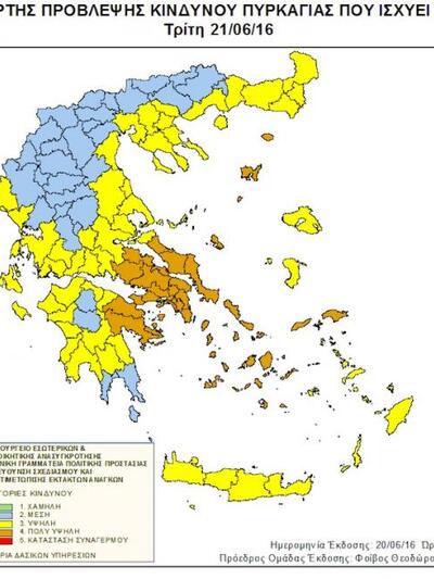 Σύμφωνα με το Χάρτη Πρόβλεψης Κινδύνου Πυρκαγιάς που εκδίδει η Γενική Γραμματεία Πολιτικής Προστασίας του Υπουργείου Εσωτερικών & Διοικητικής Ανασυγκρότησης (www.civilprotection.gr), για αύριο Τρίτη 21 Ιουνίου 2016, προβλέπεται πολύ υψηλός κίνδυνος πυρκαγιάς (κατηγορία κινδύνου 4) για τις εξής περιοχές: