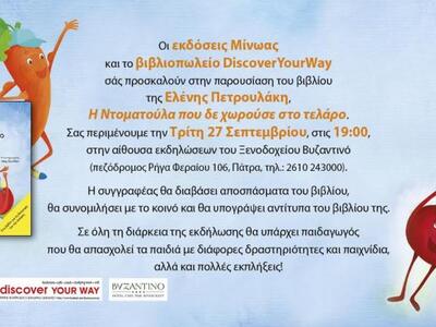 Το βιβλίο που κυκλοφόρησε τον περασμένο Μάιο από τις εκδόσεις Μίνωας, θα παρουσιαστεί σε εκδήλωση στην Πάτρα, την Τρίτη 27 Σεπτεμβρίου 2016 στις 19.00 το απόγευμα, στο ξενοδοχείο Βυζαντινόν, στην Ρήγα Φεραίου. Η Ελένη Πετρουλάκη, όπως αναφέρει η πρόσκληση της εκδήλωσης, θα μιλήσει για το βιβλίο της, θα διαβάσει αποσπάσματα του, θα απαντήσει σε ερωτήσεις του κοινού και φυσικά θα υπογράψει αντίτυπα του βιβλίου της. Στο χώρο της εκδήλωσης θα υπάρχει και παιδαγωγός που θα απασχολεί τα παιδιά με διάφορες δραστηριότητες και παιχνίδια.