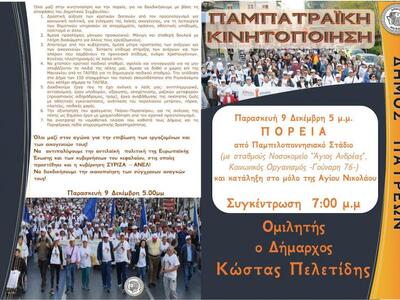 Η πορεία θα πραγματοποιηθεί στις 9 Δεκεμβρίου.Θα ξεκινήσει στις 5 το απόγευμα, από το Παμπελοποννησιακό Στάδιο, θα συνεχίσει με σταθμούς στο Νοσοκομείο «Αγ. Ανδρέας» και στον Κοινωνικό Οργανισμό του Δήμου (Γούναρη 76) και θα καταλήξει στο μόλο της Αγίου Νικολάου. Εκεί θα διοργανωθεί μεγάλη συγκέντρωση, με ομιλητή τον Δήμαρχο και θα ολοκληρωθεί με μουσικοχορευτική παράσταση από το Χορευτικό Τμήμα του Δήμου Πατρέων.