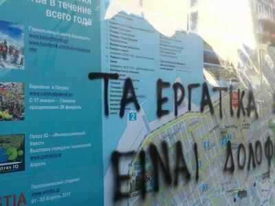 Ένα σύνθημα επικαλύπτει από χθες τον έναν από τους δύο τουριστικούς χάρτες που τοποθέτησε πρόσφατα το Επιμελητήριο Αχαΐας, στη συμβολή των οδών Αγίου Νικολάου και Ρήγα Φεραίου, στο κέντρο της Πάτρας.