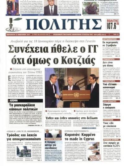Αξίζει να σημειωθεί ότι ενδεικτικό της κρίσης που υπάρχει ανάμεσα σε Αθήνα και Λευκωσία είναι το σημερινό πρωτοσέλιδο της κυπριακής εφημερίδας "Πολίτης" που πρόσκειται στο Νίκο Αναστασιάδη με τίτλο «Συνέχεια ήθελε ο γ.γ. όχι όμως ο Κοτζιάς» και υπότιτλο: «Σύγχυση από εσπευσμένες ανακοινώσεις του Έλληνα υπεξ».