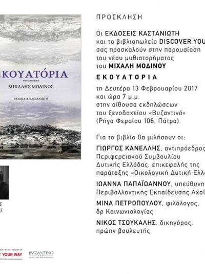 Το βιβλιοπωλείο Discover your Way και οι εκδόσεις Καστανιώτη συνδιοργανώνουν την Δευτέρα 13 Φεβρουαρίου 2017 εκδήλωση παρουσίασης του νέου βιβλίου του Μιχάλη Μοδινού με τίτλο" ΕΚΟΥΑΤΟΡΙΑ".