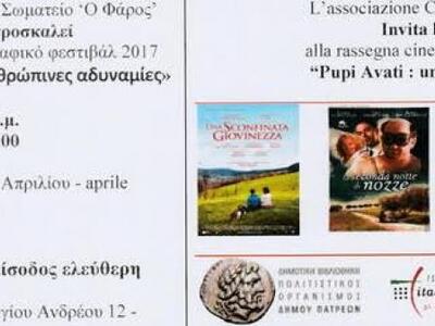 Το Δίκτυο Πολιτιστικής Συνεργασίας στην Ελλάδα, με την αιγίδα του Ιταλικού Μορφωτικού Ινστιτούτου Αθηνών διοργανώνει το Ιταλικό Κινηματογραφικό Φεστιβάλ 2017 – «Pupi Avati: ανθρώπινες αδυναμίες», με την προβολή 4 ταινιών, με ελληνικούς υπότιτλους.