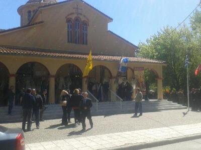 Στην εξόδιο ακολουθία, που τελέστηκε στις 12 το μεσημέρι, παραβρέθηκαν, μεταξύ άλλων, ο υπουργός Εθνικής Άμυνας, Πάνος Καμμένος, η αναπληρώτρια υπουργός Εργασίας, Ράνια Αντωνοπούλου, ο υφυπουργός Αγροτικής Ανάπτυξης και Τροφίμων, Βασίλης Κόκκαλης, ο αρχηγός ΓΕΕΘΑ, Ευάγγελος Αποστολάκης και ο περιφερειάρχης Θεσσαλίας, Κώστας Αγοραστός.