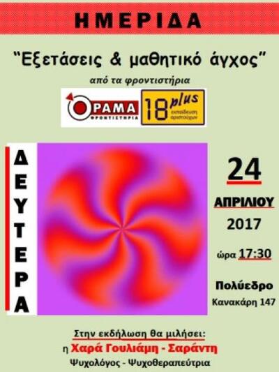 Τα φροντιστήρια ΟΡΑΜΑ/18Plus τη Δευτέρα 24 Απριλίου και ώρα 17.30 οργανώνουν ημερίδα για τους μαθητές τους και τους γονείς τους με θέμα «Εξετάσεις & μαθητικό άγχος». Στην ημερίδα που θα πραγματοποιηθεί στον κήπο του Πολύεδρου (Κανακάρη 147) θα μιλήσει η ψυχολόγος - ψυχοθεραπεύτρια Χαρά Γουλιάμη - Σαράντη.