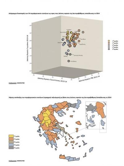 Οι περιφερειακές ενότητες εμφανίζονται σημαντικά διαφοροποιημένες ως προς το δείκτη χαμηλής επίδοσης του μαθητικού πληθυσμού, με παράλληλη τάση διεύρυνσης των διαφοροποιήσεων μεταξύ των περιφερειακών ενοτήτων κατά την περίοδο αναφοράς 2002-2014, με εξαίρεση τη δευτεροβάθμια επαγγελματική εκπαίδευση όπου διακρίνεται μια σαφής τάση μείωσής τους.