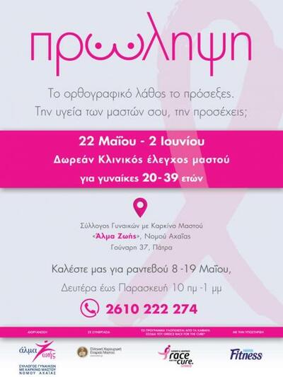 Ο Πανελλήνιος Σύλλογος Γυναικών με Καρκίνο Μαστού «Άλμα Ζωής» για ακόμα μία χρονιά διοργανώνει το Πρόγραμμα Ενημέρωσης και Κλινικής Εξέτασης μαστού για νέες γυναίκες 20-39 ετών, σε συνεργασία με την Ελληνική Χειρουργική Εταιρεία Μαστού (ΕΧΕΜ). Θα πραγματοποιείται για 2 εβδομάδες, από Δευτέρα 22 Μαΐου έως Παρασκευή 2 Ιουνίου ταυτόχρονα σε Αθήνα – Πάτρα και Θεσσαλονίκη.