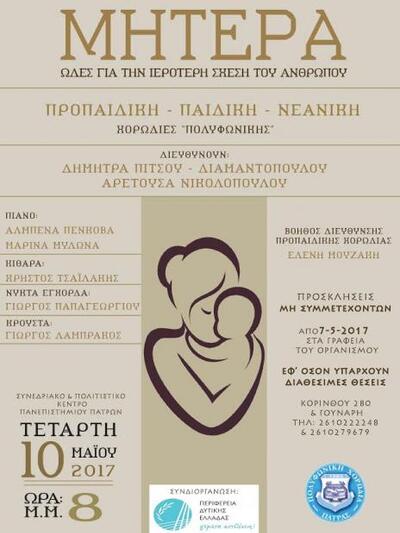 "Η συναυλία θα πραγματοποιηθεί στο Συνεδριακό και Πολιτιστικό Κέντρο του Πανεπιστημίου Πατρών, στις 8 το βράδυ [ακριβώς] και θα έχει σαν άξονα την αναφορά της μουσικής στη ΜΗΤΕΡΑ, μέσα από τα έργα που τα τμήματα θα ερμηνεύσουν.