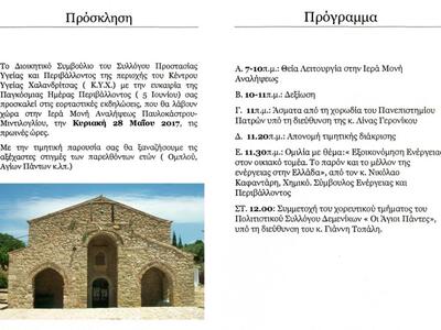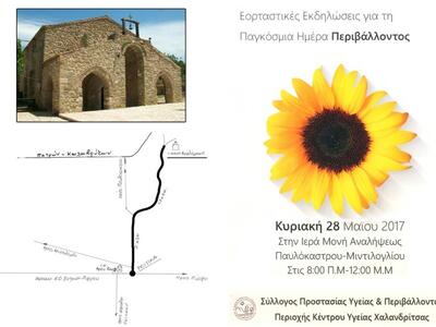 Το Διοικητικό Συμβούλιο του Συλλόγου Προστασίας Υγείας και Περιβάλλοντος της περιοχής του Κέντρου Υγείας Χαλανδρίτσας ( Κ.Υ.Χ.) με την ευκαιρία της Παγκόσμιας Ημέρας Περιβάλλοντος ( 5 Ιουνίου) πραγματοποιεί εορταστικές εκδηλώσεις. Οι εκδηλώσεις θα λάβουν χώρα στην Ιερά Μονή Αναλήψεως Παυλοκάστρου- Μιντιλογλίου, την Κυριακή 28 Μαΐου 2017, τις πρωινές ώρες.