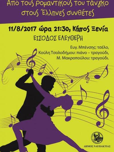 O Δήμος Ναυπακτίας διοργανώνει συναυλία με ιδιαίτερα ηχοχρώματα και ρυθμούς, «Από τους ρομαντικούς συνθέτες του τάνγκο στους Έλληνες συνθέτες»|, την Παρασκευή 11 Αυγούστου στις 9:30 μ.μ., στον Κήπο του Ξενία, στη Ναύπακτο.