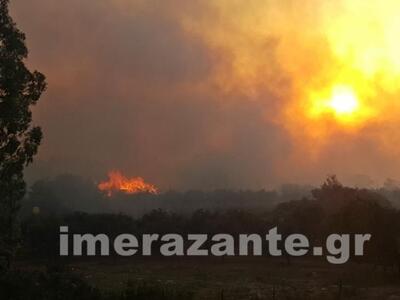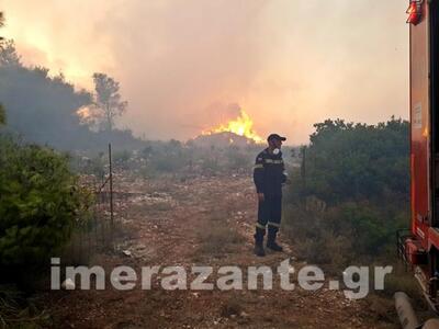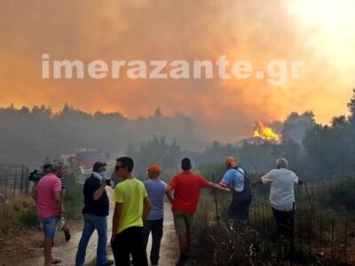 Οι δυνατοί άνεμοι που πνέουν στην Ζάκυνθο φτάνουν τα 6-7 μποφόρ, γεγονός που δυσκολεύει το έργο των πυροσβεστών.