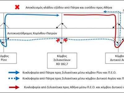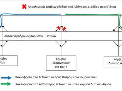 Από την Πέμπτη 07/09/2017 έως το Σάββατο 09/09/2017 το αργότερο, θα αποκλειστούν αρχικά οι νότιοι κλάδοι (εξόδου της κατεύθυνσης από Πάτρα και εισόδου στην κατεύθυνση προς Αθήνα) του Κόμβου Σελιανιτίκων και εν συνεχεία μόλις αρθεί ο ανωτέρω αποκλεισμός, θα αποκλειστούν οι βόρειοι κλάδοι (εξόδου της κατεύθυνσης από Αθήνα και εισόδου στην κατεύθυνση προς Πάτρα) του Κόμβου Σελιανίτικων του αυτοκινητοδρόμου της Κορίνθου-Πατρών.