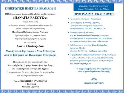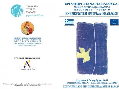 Το Εργαστήρι «ΠΑΝΑΓΙΑ ΕΛΕΟΥΣΑ» νομού Αιτωλοακαρνανίας για άτομα με νοητική υστέρηση και συνοδές αναπηρίες, με την ευκαιρία του εορτασμού της Παγκόσμιας Ημέρας Ατόμων με Αναπηρία σε συνεργασία με την Περιφέρεια Δυτικής Ελλάδας διοργανώνουν την Κυριακή 3 Δεκεμβρίου 2017 ενημερωτική ημερίδα- εκδήλωση. Συμμετέχει η σοπράνο Σόνια Θεοδωρίδου, «Μια Αγκαλιά Τραγούδια - Μια Ανθολογία από το Ελληνικό και Παγκόσμιο Ρεπερτόριο», Ορχήστρα Mobile- Μουσική Διεύθυνση: Θεόδωρος Ορφανίδης.