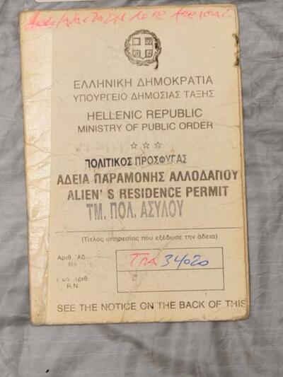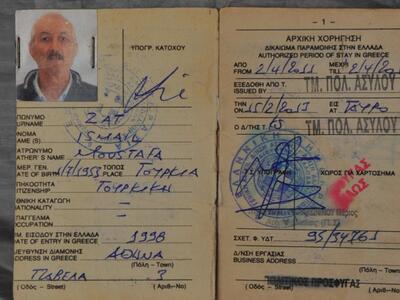άδεια παραμονής αλλοδαπού με στοιχεία κατόχου «ZAT ISMAIL» του «ΜOUSTAFA», γεννηθείς 01-07-1953 στην Τουρκία, στο εμπροσθόφυλλο της οποίας υπήρχε, μεταξύ άλλων, η χειρόγραφη ένδειξη «ΤΠΑ 34020»,