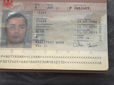 πλαστό διαβατήριο Αρχών Δημοκρατίας της Αυστρίας με αριθμό «Ρ3012405», όνομα κατόχου «ΥΑSAR CIHAN» και ημερομηνία γέννησης 23-09-1986 στην Αυστρία,