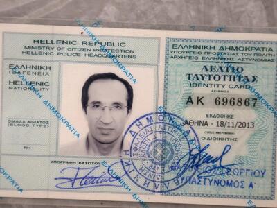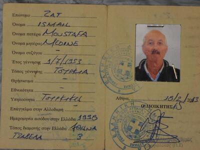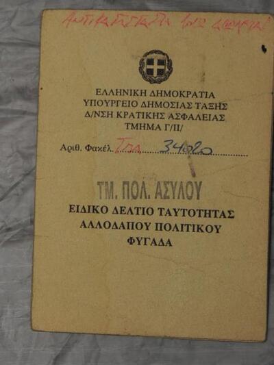 ειδικό δελτίο ταυτότητας αλλοδαπού πολιτικού φυγάδα, με αναγραφόμενα στοιχεία «ZAT ISMAΙL» του «ΜOUSTAFA», γεννηθείς 01-07-1953 στην Τουρκία, στο εμπροσθόφυλλο του οποίου υπήρχε, μεταξύ άλλων, η χειρόγραφη ένδειξη «ΤΠΑ 34020».