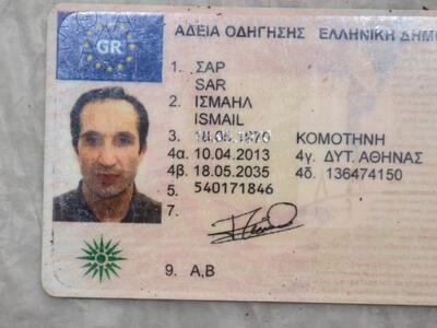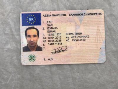 πλαστή άδεια οδήγησης Ελληνικών Αρχών με αριθμό «540171846», όνομα κατόχου «ΣΑΡ ΙΣΜΑΗΛ» και ημερομηνία γέννησης 18-05-1970 στην Κομοτηνή