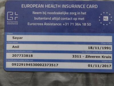 ευρωπαϊκή κάρτα υγείας με αριθμό «09229194530002373517», εκδοθείσα από Αρχές της Ολλανδίας, με όνομα κατόχου « Sayar Anil » και ημερομηνία γέννησης 18-11-1991,