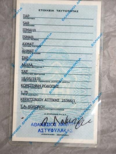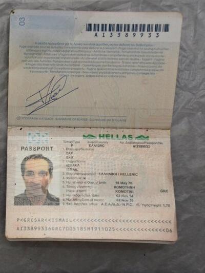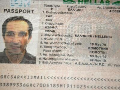 πλαστό διαβατήριο Ελληνικών Αρχών με αριθμό «ΑΙ 3389933», όνομα κατόχου «ΣΑΡ ΙΣΜΑΗΛ», γεννηθείς 18-05-1970 στην Κομοτηνή,