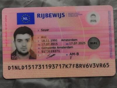 άδεια οδήγησης εκδοθείσα από Αρχές της Ολλανδίας, με στοιχεία κατόχου «Sayar Anil» και ημερομηνία γέννησης 18-11-1991 στο Άμστερνταμ,