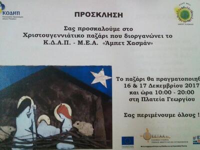 -ΑΥΡΙΟ Σάββατο 16 και ΜΕΘΑΥΡΙΟ Κυριακή 17 Δεκέμβρη, στο Χριστουγεννιάτικο χωριό της πλατείας Γεωργίου, θα διεξαχθεί το Χριστουγεννιάτικο Παζάρι του Κέντρου Δημιουργικής Απασχόλησης Παιδιών Με Αναπηρία ( Κ.Δ.Α.Π. ΜεΑ.) "ΑΜΠΕΤ ΧΑΣΜΑΝ " του Κοινωνικού Οργανισμού, από τις 10:00 π.μ. μέχρι τις 8.00 μ.μ.