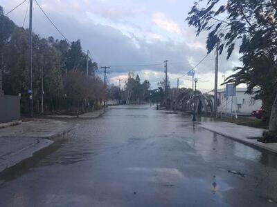 Συνεργεία του δήμου καθαρίζουν τα φρεάτια και το δρόμο από τις πέτρες της θάλασσας που βγήκε στη στεριά λόγω των ανέμων.