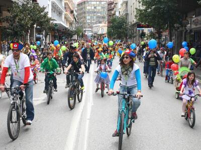 Οι καρναβαλικοί μπόμπιρες με τα μεταμφιεσμένα ποδήλατά τους εν δράσει (ποδηλατοδρομία μεταμφιεσμένων με αφετηρία το Σχολικό Συγκρότημα Τεμπονέρα και παιχνίδια στα Υψηλά Αλώνια).