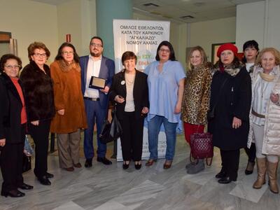 Οι ομιλίες ήταν πραγματικά εξαιρετικές και καθήλωσαν τους 350 και πλέον παρευρισκόμενους στην εκδήλωση. Ο Όμιλος Εθελοντών κατά του Καρκίνου «ΑγκαλιάΖΩ» Ν. Αχαΐας θα ήθελε να ευχαριστήσει δημοσίως από καρδιάς τους ομιλητές και το Προεδρείο της εκδήλωσης που απαρτιζόταν από την κυρία Χριστοπούλου Αθηνά, Διευθύντρια Ε.Σ.Υ. Γ.Ν.Π. «Ο Άγιος Ανδρέας» και τον Μαγκαφά Παναγιώτη, Κοινωνικό Λειτουργός ΑγκαλιάΖΩ, ο οποίος και βραβεύτηκε με τιμητική πλακέτα από σύσσωμο το Δ.Σ. του ΑγκαλιάΖΩ για την πολυετή προσφορά του και στήριξη του ΑγκαλιάΖΩ, αλλά και την Συντονίστρια κυρία Αναστασοπούλου Ιωάννα, Υπεύθυνη του Τμήματος Περίθαλψης και Κοινωνικής Μέριμνας του ΤΕΙ.