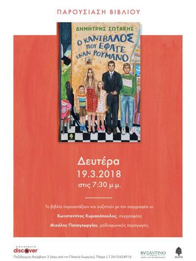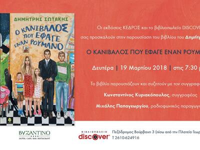 Οι εκδόσεις Κέδρος και το βιβλιοπωλείο Discocer συνδιοργανώνουν την παρουσίαση του νέου βιβλίου του Δημήτρη Σωτάκη με τίτλο «Ο Κανίβαλος που έφαγε έναν Ρουμάνο». Η εκδήλωση θα γίνει την Δευτέρα 19 Μαρτίου 2018, στις 19.30 και θα μιλήσουν οι: Κωνσταντίνος Κυριακόπουλος, συγγραφέας και Μιχάλης Παπαγεωργίου, ραδιοφωνικός παραγωγός και δημοσιογράφος.
