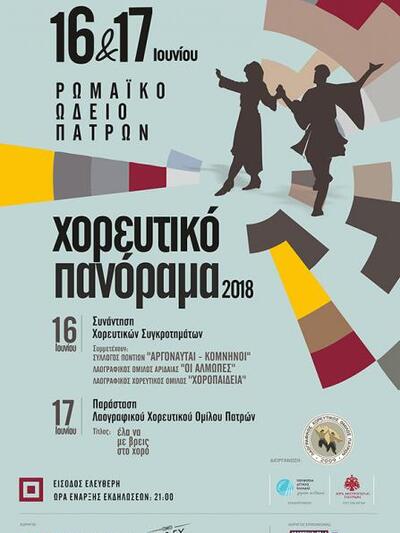 Ο Λαογραφικός Χορευτικός Όμιλος Πατρών παρουσιάζει στο Ρωμαϊκό Ωδείο Πατρών το «Χορευτικό Πανόραμα 2018». Ένα διήμερο μουσικοχορευτικών εκδηλώσεων με ελεύθερη είσοδο, που διοργανώνεται με τον εθελοντισμό των χορευτών-μελών του Ομίλου και αποτελεί πια θεσμό για τα χορευτικά και πολιτιστικά δρώμενα της πόλης. Το διήμερο θα συμμετάσχουν 400 και πλέον χορευτές με ιδιαίτερες φορεσιές του τόπου μας πλαισιωμένοι από ζωντανές ορχήστρες.