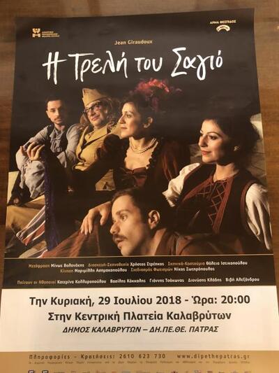 Ο Δήμαρχος Πατρέων Κώστας Πελετίδης και το Δημοτικό Περιφερειακό Θέατρο (ΔΗ.ΠΕ.ΘΕ.) Πάτρας – Άρμα Θέσπιδος αποδέχθηκαν πρόταση του Δημάρχου Καλαβρύτων Γιώργου Λαζουρά και θα παρουσιάσουν, υπό την αιγίδα και με την υποστήριξη του Δήμου Καλαβρύτων, την Κυριακή 29 Ιουλίου 2018 στις 20:00, στην κεντρική Πλατεία των Καλαβρύτων, το εξαιρετικό θεατρικό έργο «Η Τρελή του Σαγιό» του Ζαν Ζιροντού, με δωρεάν και ελεύθερη παρουσία του κοινού.