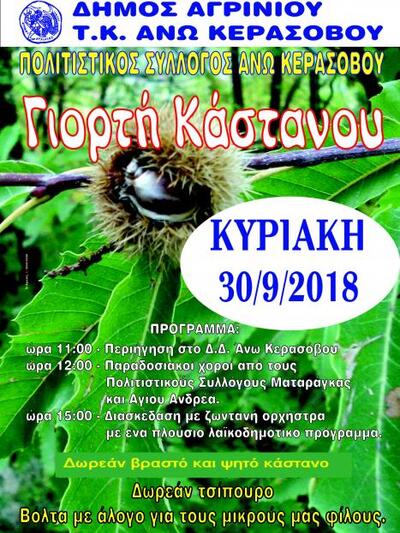 Αυτή την Κυριακή 30 Σεπτεμβρίου 2018 θα λάβει χώρα στην τοπική κοινότητα Άνω Κεράσοβου του Δήμου Αγρινίου, Γιορτή κάστανου όπου θα προσφερθούν σε όσους πάνε, βραστά και ψητά κάστανα αλλά και δωρεάν τσίπουρο.