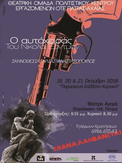 Μετά την περσινή επιτυχία που είχαν οι θεατρικές παραστάσεις του έργου "Ο Αυτόχειρας του Νικολάϊ Έρντμαν, από τη θεατρική ομάδα του Πολιτιστικού Κέντρου Εργαζομένων ΟΤΕ Πάτρας-Αχαΐας, το έργο επιστρέφει στη σκηνή του θεάτρου Αγορά στην οδό Καραισκάκη.
