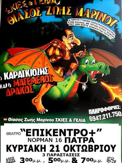 Ο θίασος της Ζωής Μαρίνου, Σκιές & Γέλια θα παρουσιάσει αυτή την Κυριακή 21/10/2018 την παράσταση καραγκιόζη με τίτλο «Ο Καραγκιόζης και ο μαγεμένος δράκος» στο Επίκεντρο+ στην Αγ. Διονυσίου και Νόρμαν στην Πάτρα.